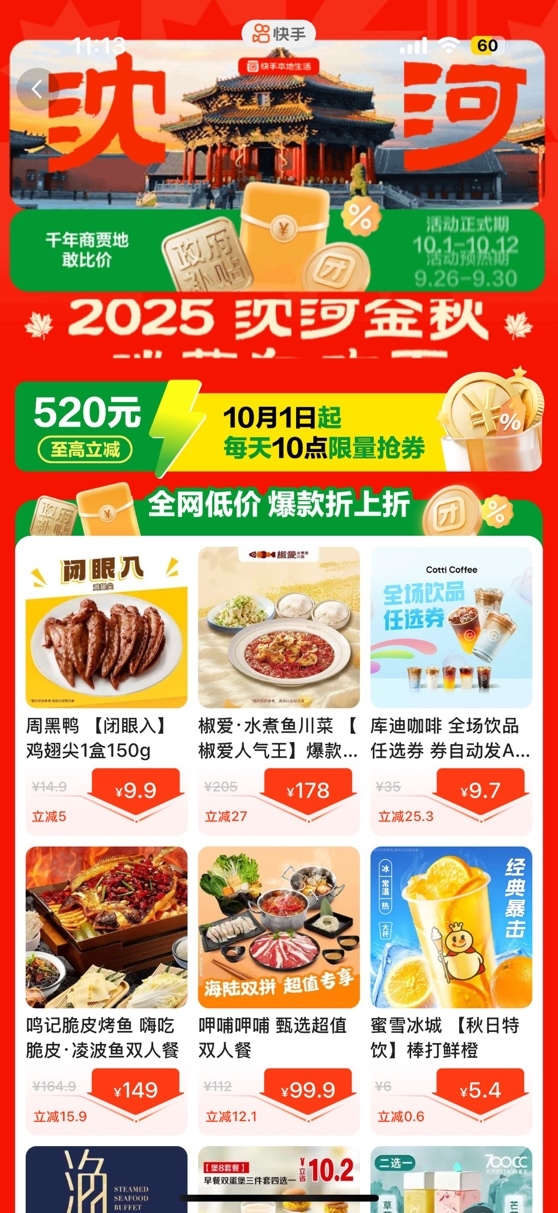 9月26日,沈阳市沈河区人民政府联合快手本地生活业务宣布推出“千年商贾地·敢比价-2025沈河金秋消费狂欢季”活动。围绕即将到来的国庆及中秋双节,10月1日-10月12日,用户可通过快手平台领取沈河区人民政府及快手平台联合发放的消费券,单品补贴金额最高达520元。
