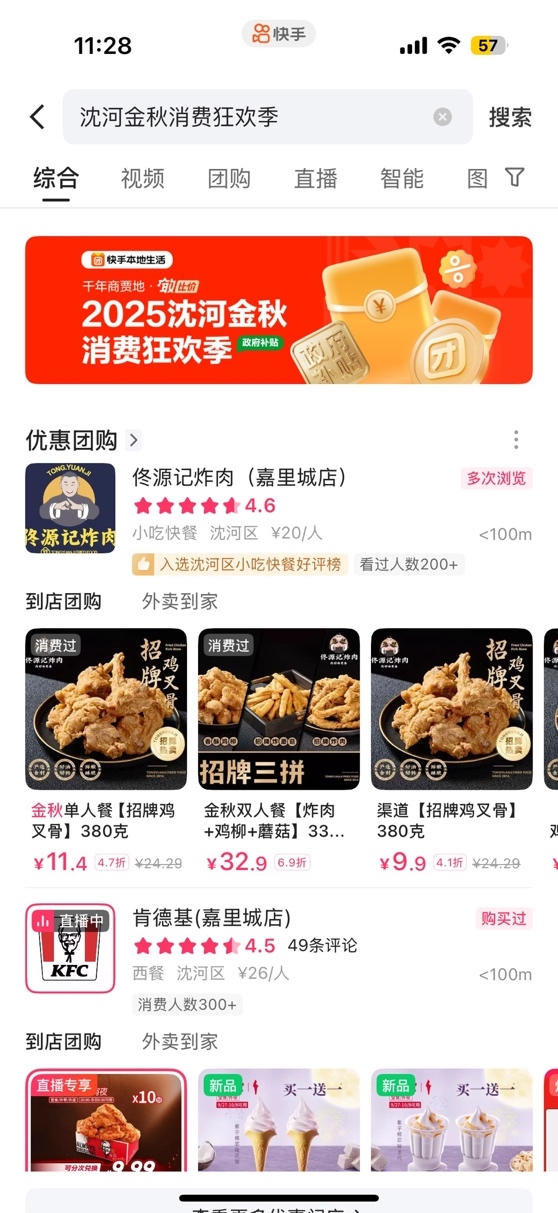 快手本地生活针对本次活动推出“沈河消费券”活动专属会场,用户可在快手APP搜索“沈河金秋消费狂欢季”关键词进入活动会场领取消费券,并能直观看到商品到手价及优惠力度。