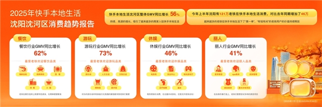 辽宁一直是快手本地生活成交规模领先的省份,2024年成交规模全国排名第二。2025年9月26日,快手本地生活发布了《2025年快手本地生活沈阳沈河区消费趋势报告》。数据显示,今年上半年,快手本地生活沈阳沈河区整体GMV同比增长 56%,同时有超过120万沈阳老铁在快手本地生活进行消费,对比去年同期增加46万人。